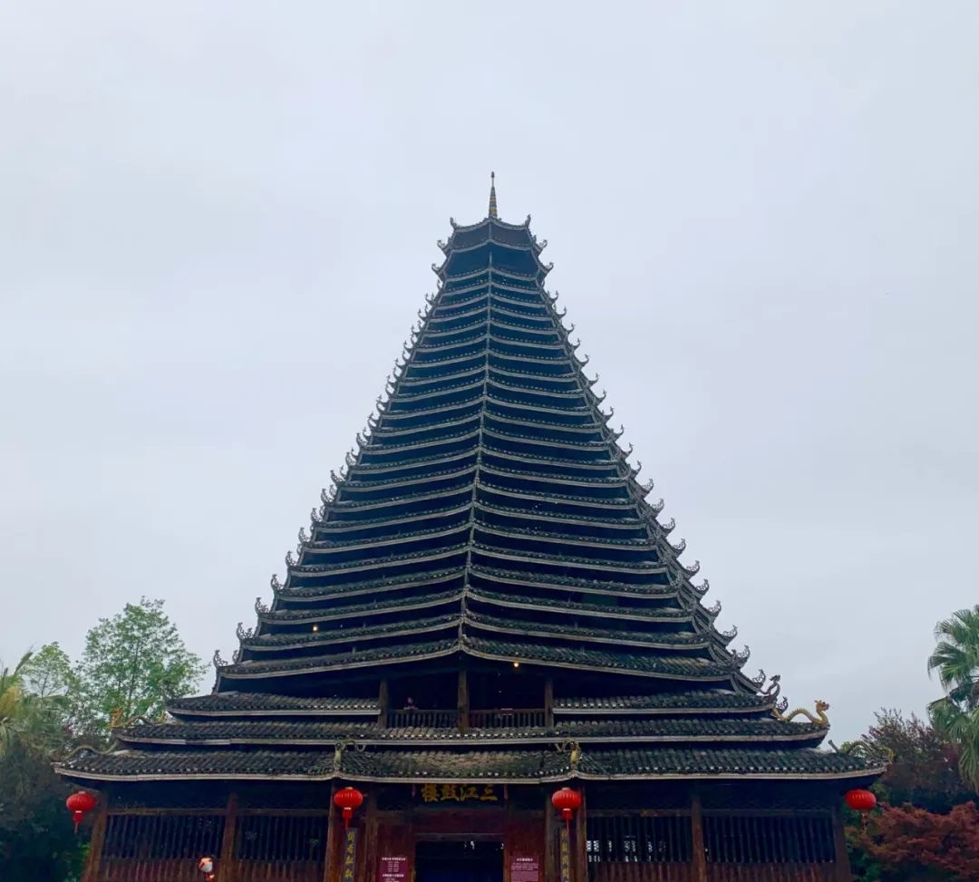 被譽(yù)為“世界第一鼓樓,大侗寨的標(biāo)志性建筑,三江鼓樓高42.6米,共有60根柱頭著地,占地面積600平方米。鼓樓共有27層瓦檐,除樓頂兩層外,其余25層瓦面等距收分,層層緊縮,使樓面呈金字塔形,顯得端莊平穩(wěn)。每層檐角輕盈起翹,精巧的雕飾以及鮮艷的檐板彩繪,與龐大、粗獷的樓身形成鮮明對比。